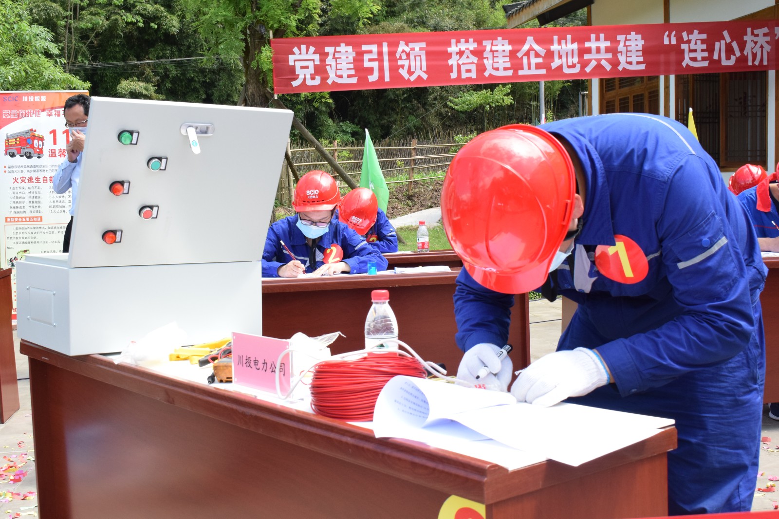 隨后,川投能源黨委副書(shū)記、工會(huì)主席冉蘭平宣布比賽開(kāi)始。6家電力企業(yè)、18名參賽選手在全場(chǎng)觀眾的歡呼聲中走入賽場(chǎng),圍繞電廠安全操作和防洪防汛,按照電廠組接線圖編寫(xiě)標(biāo)準(zhǔn)操作步驟,運(yùn)用現(xiàn)場(chǎng)設(shè)備清單設(shè)計(jì)防洪警鈴并組裝防洪報(bào)警箱,在操作票填寫(xiě)、電氣原理圖設(shè)計(jì)、配線安裝調(diào)試三個(gè)項(xiàng)目上逐一“捉對(duì)廝殺”,筆試項(xiàng)目運(yùn)筆如飛、實(shí)操項(xiàng)目揮汗如雨,力求展現(xiàn)自身最高技能水平和最美職業(yè)風(fēng)采。經(jīng)過(guò)近2個(gè)小時(shí)的激烈角逐,川投電力代表隊(duì)脫穎而出,榮獲一等獎(jiǎng);槽漁灘公司、天全勝利電力獲二等獎(jiǎng);天彭電力、大唐雅安公司、天全長(zhǎng)河水電獲三等獎(jiǎng)。