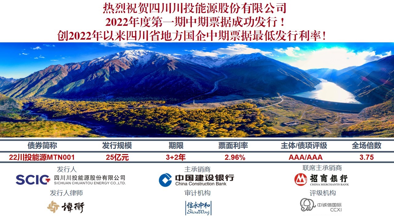 5月20日,川投能源公司2022年度第一期中期票據(jù)25億元成功發(fā)行。本期中期票據(jù)發(fā)行規(guī)模為25億元,發(fā)行利率2.96%,全場倍數(shù)3.75倍。