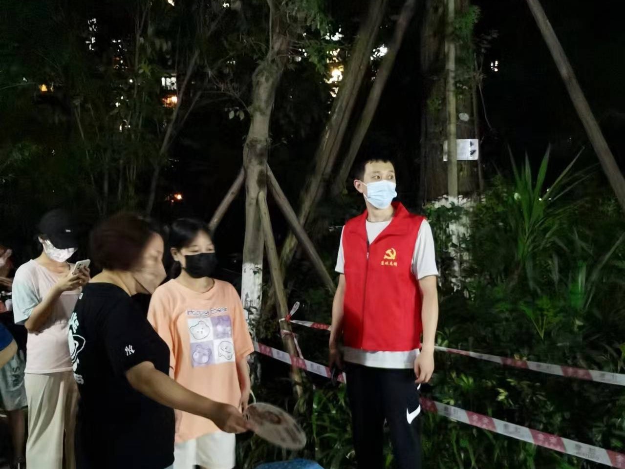 由于封控小區(qū)大多數(shù)居民選擇網(wǎng)上下單購買物資,大量物資堆放在小區(qū)大門,為確保大家生活物資供應(yīng)正常,黃黌贇化身“配送員”,第一時(shí)間攬下了這項(xiàng)體力活。白天閑暇時(shí)在烈日暴曬下推著大型購物車穿梭在小區(qū)內(nèi),為居民運(yùn)送物資,保障居民正常生活,與其他志愿者一道,共同守護(hù)者小區(qū)居民生活物資保障中的“最后100米”。傍晚,黃黌贇化身“引導(dǎo)員”,協(xié)助搭建遮陽傘,搬運(yùn)防疫物資,布置核酸檢測場地,維持現(xiàn)場秩序,引導(dǎo)居民進(jìn)行核酸檢測,提供暖心服務(wù),助力核酸采集工作高效開展。往往一天的工作還未結(jié)束,他的手掌被泡得發(fā)白發(fā)皺,汗水早已經(jīng)浸透全身。