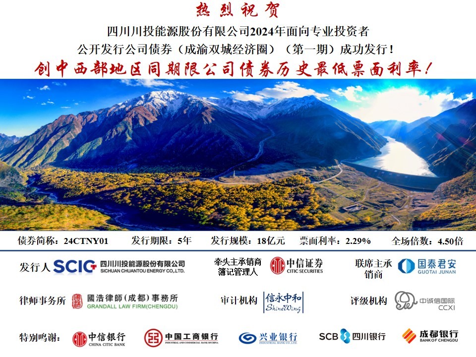 7月10日,川投能源2024年面向?qū)I(yè)投資者公開(kāi)發(fā)行公司債券(成渝雙城經(jīng)濟(jì)圈)(第一期)成功發(fā)行。本期公司債券發(fā)行規(guī)模18億元,期限5年,票面利率2.29%,創(chuàng)中西部地區(qū)同期限公司債券歷史最低發(fā)行票面利率。