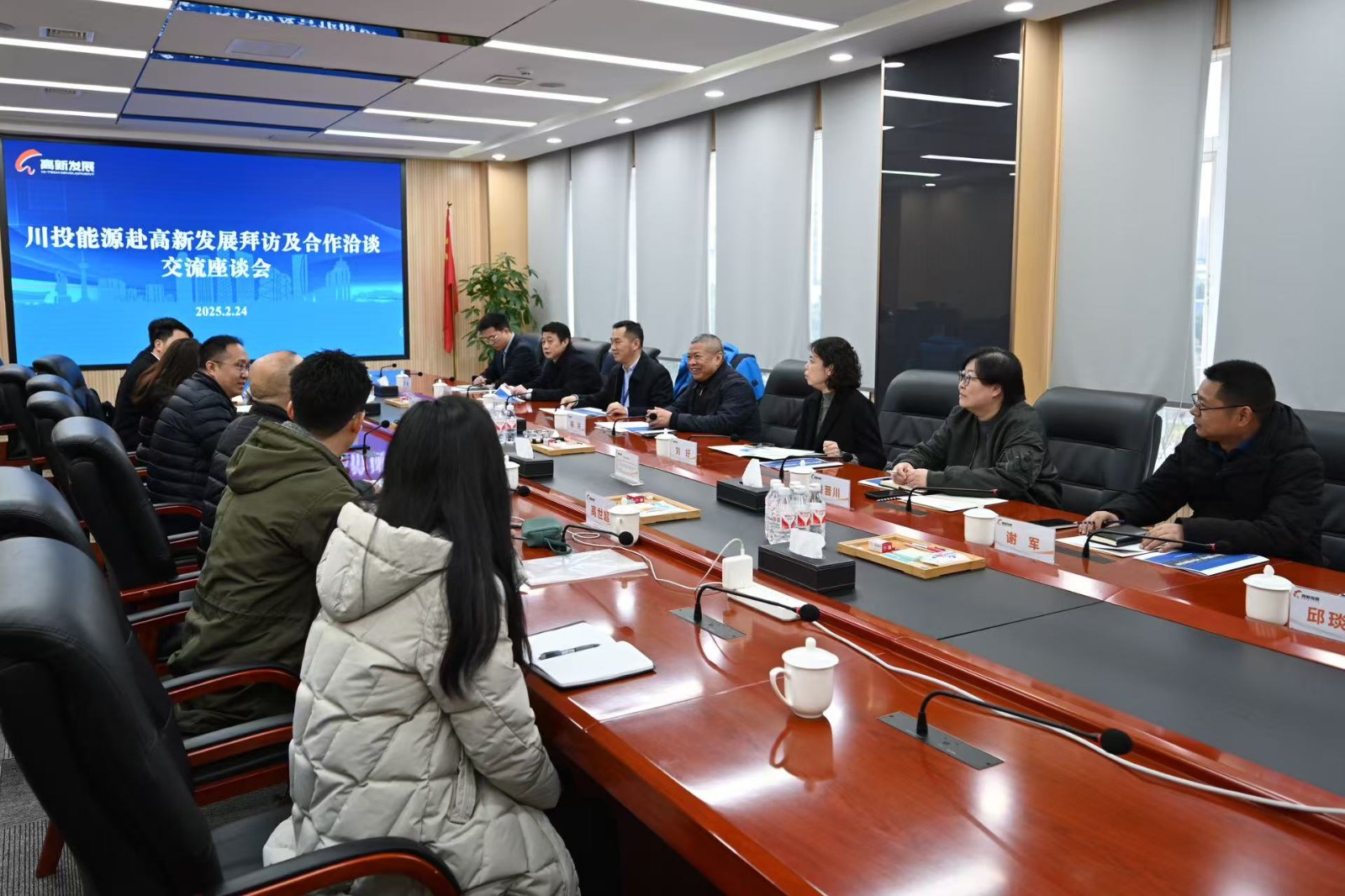 2月24日,川投能源黨委書記、副董事長(zhǎng)、總經(jīng)理?xiàng)詈槁赎?duì)拜訪成都高新發(fā)展股份有限公司,雙方就深化合作進(jìn)行座談交流。高新發(fā)展黨委書記、董事、總經(jīng)理馮東主持座談。
