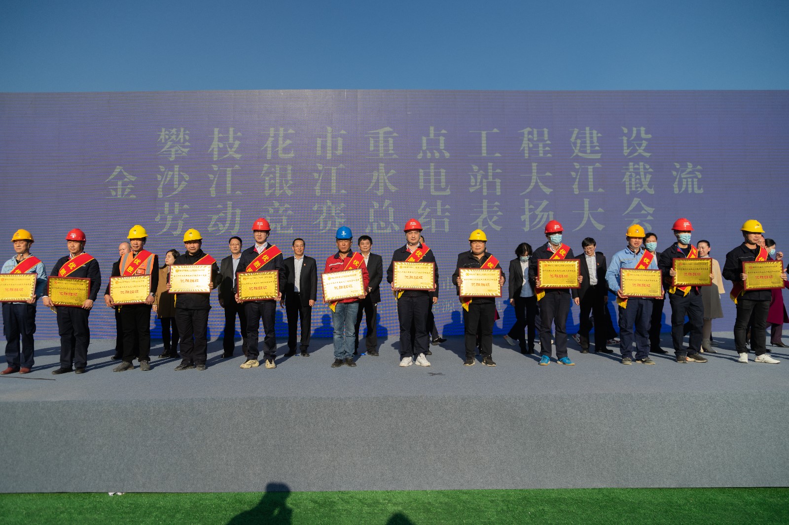 會(huì)議首先由川投能源副總經(jīng)理、攀水電公司黨總支書記、董事長徐孝剛作大江截流勞動(dòng)競賽總結(jié)報(bào)告,在攀枝花市重點(diǎn)工程建設(shè)勞動(dòng)競賽的安排部署下,通過開展“勠力奮戰(zhàn)三百天、打贏截流攻堅(jiān)戰(zhàn)”等勞動(dòng)競賽活動(dòng),取得了提前一年實(shí)現(xiàn)大江截流良好成績。公司黨總支委員、總經(jīng)理吳巍嶼宣讀了《攀枝花市總工會(huì)關(guān)于表揚(yáng)金沙江銀江水電站大江截流勞動(dòng)競賽優(yōu)秀集體、優(yōu)勝班組、先進(jìn)個(gè)人的決定》,與會(huì)領(lǐng)導(dǎo)共同為受表彰的10個(gè)優(yōu)秀集體、13個(gè)優(yōu)勝班組、30名先進(jìn)個(gè)人授牌頒獎(jiǎng)并頒發(fā)證書,獲獎(jiǎng)的先進(jìn)集體和先進(jìn)個(gè)人代表分別作了發(fā)言。