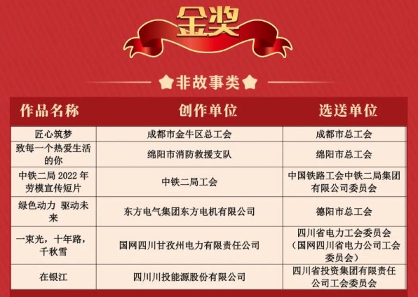 在熱烈慶祝黨的二十大勝利召開之際,由四川省總工會(huì)主辦的本次大賽受到了各地市州、央企、國企的熱烈追捧,選送故事類作品137部,非故事類作品685部。經(jīng)過初評(píng)初評(píng),共有245部作品入圍終評(píng)。經(jīng)過專家評(píng)委的綜合評(píng)審,最終評(píng)選出故事類、非故事類作品金獎(jiǎng)各6部、銀獎(jiǎng)各8部、銅獎(jiǎng)各12部,優(yōu)秀獎(jiǎng)各25部。可謂百花齊放、精彩紛呈,競(jìng)爭(zhēng)十分激烈。