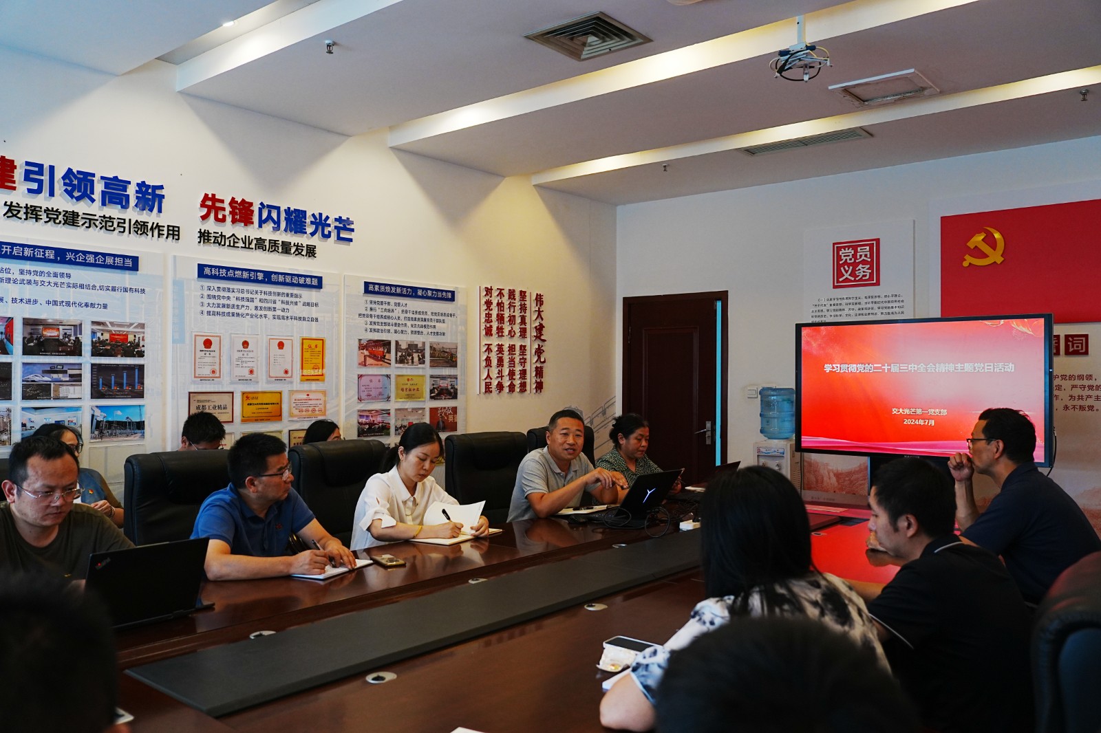 7月29日,交大光芒第一黨支部開展學(xué)習(xí)貫徹黨的二十屆三中全會及省委十二屆五中全會精神主題黨日活動?;顒佑芍Р繒浲踺x主持,支部全體黨員、入黨積極分子參加。黨總支書記、常務(wù)副總經(jīng)理王濤以及黨總支副書記、總經(jīng)理助理汪志橋以普通黨員身份參加。