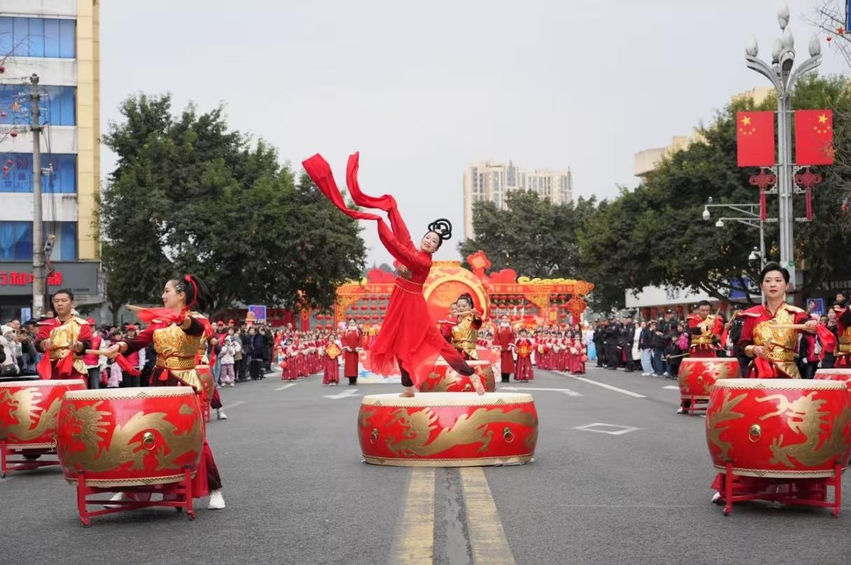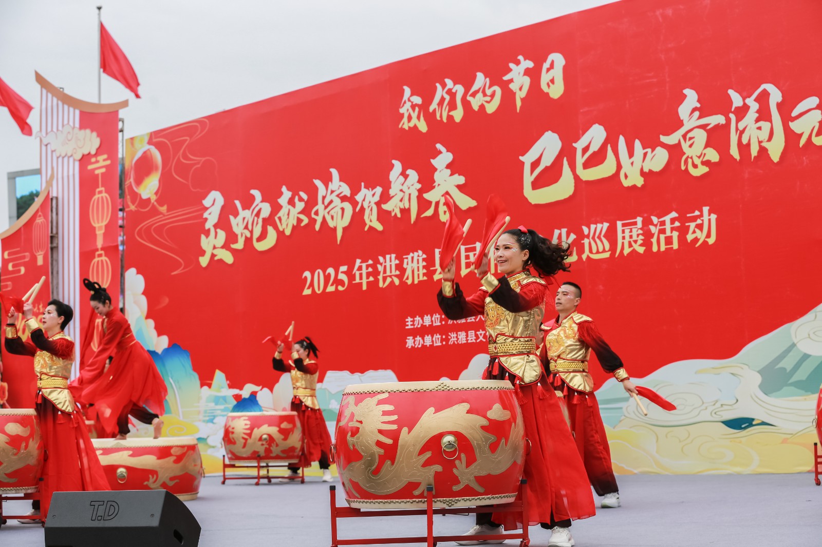 洪雅民俗文化巡展活動(dòng)是洪雅縣每年春節(jié)期間的傳統(tǒng)文化品牌,表演節(jié)目豐富多彩、精彩紛呈,深受全縣人民喜愛?;顒?dòng)當(dāng)日,民俗文化巡游隊(duì)伍從三彩廣場(chǎng)出發(fā),一直到洪雅廣場(chǎng),現(xiàn)場(chǎng)人頭攢動(dòng),熱鬧非凡。隨著激昂的鼓點(diǎn)響起,大鼓隊(duì)員們手中的鼓槌上下翻飛,富有節(jié)奏感地敲擊著大鼓。磅礴的氣勢(shì)、靈動(dòng)的韻律、美妙的舞姿瞬間點(diǎn)燃了現(xiàn)場(chǎng)氣氛,吸引了眾多市民駐足觀看、拍手稱贊。