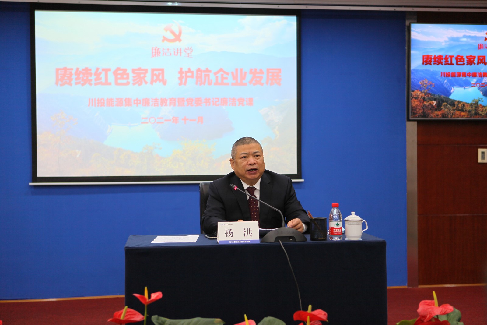 為貫徹落實(shí)中央關(guān)于全面從嚴(yán)治黨部署和要求,切實(shí)推進(jìn)公司黨風(fēng)廉政建設(shè),推動(dòng)“好風(fēng)傳家”工作落實(shí)落細(xì),2021年11月25日上午, 川投能源黨委組織召開了2021年集中廉潔教育會(huì),公司黨委書記、副董事長(zhǎng)、總經(jīng)理?xiàng)詈橐浴百s續(xù)紅色家風(fēng),護(hù)航企業(yè)發(fā)展”為題給公司黨員干部講授廉潔黨課,并組織觀看了由中央紀(jì)委國(guó)家監(jiān)委宣傳部、中央廣播電視總臺(tái)聯(lián)合制作的電視專題片《正風(fēng)反腐就在身邊》之《嚴(yán)正家風(fēng)》。公司黨委副書記、工會(huì)主席冉蘭平主持會(huì)議。